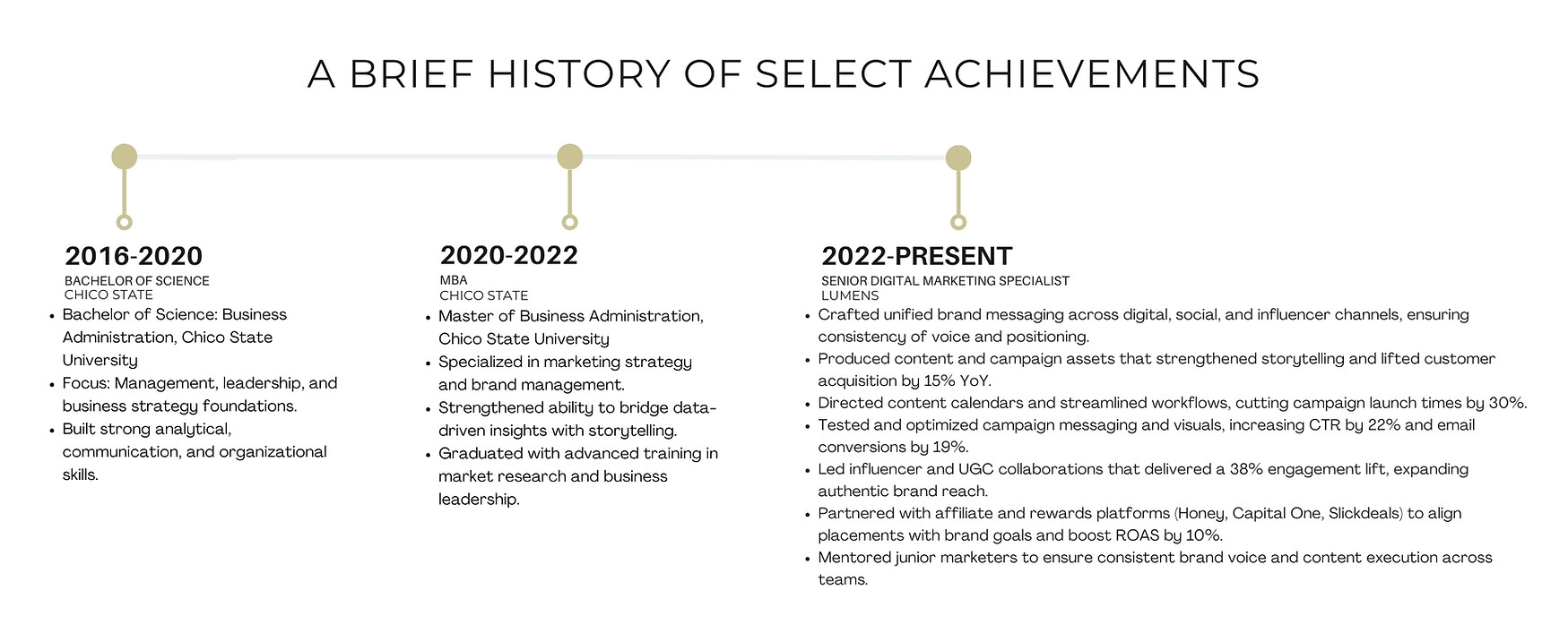 Brand marketing professional with an MBA and a track record of shaping narratives that grow awareness, strengthen positioning, and connect with audiences across channels. Known for bridging creativity with analytics to deliver double-digit engagement growth across multimillion-dollar campaigns. Experienced in building brand strategies that balance creativity with data, from messaging frameworks and campaign
